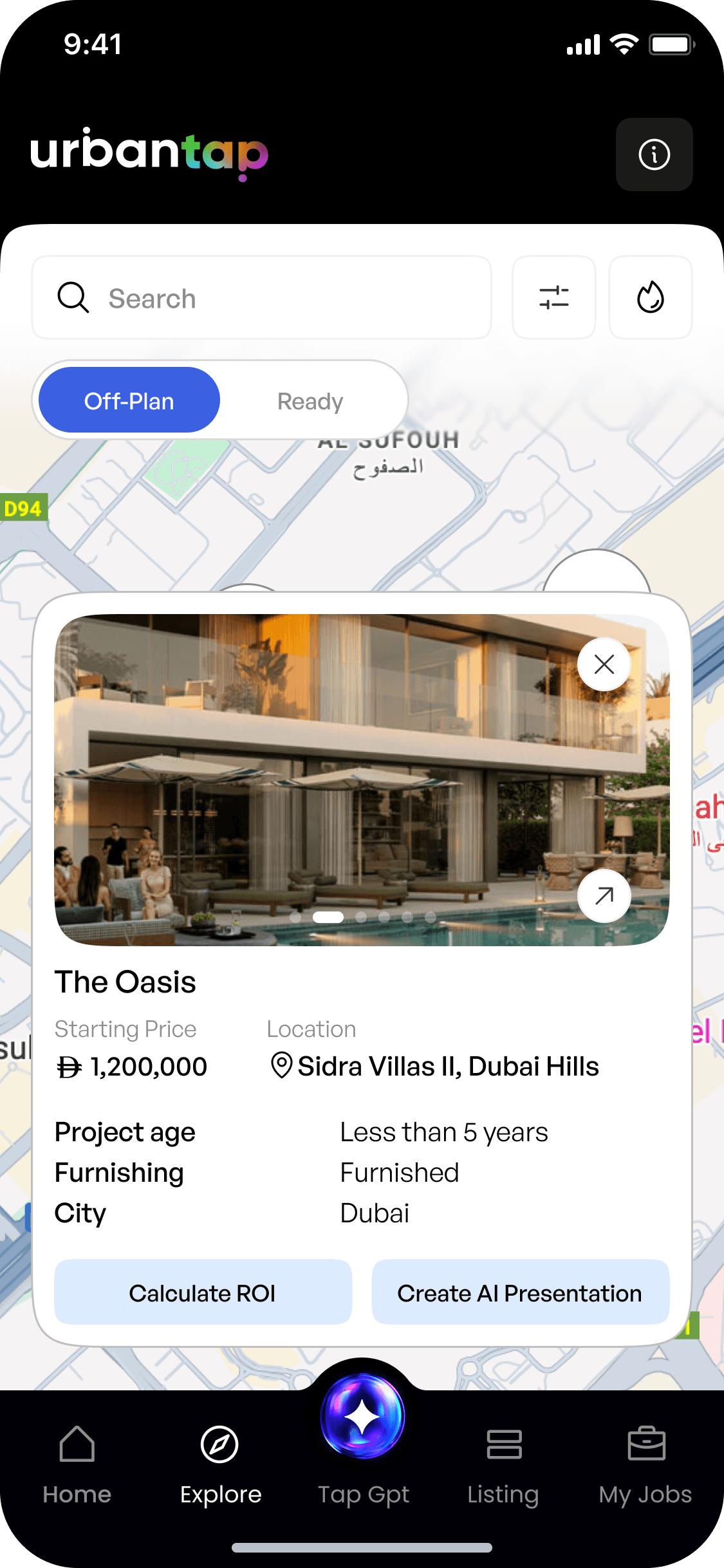 A bottom sheet reveals essential info โ price, location, furnishing โ with quick actions like Calculate ROI or Create AI Presentation.
